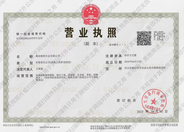 廊坊德厚木業(yè)有限公司是華北地區(qū)專(zhuān)業(yè)生產(chǎn)清水建筑模板的企業(yè)之一。坐落于中國(guó)大型生產(chǎn)市場(chǎng)--中國(guó)左各莊。毗鄰京津,北依津保高速,地理位置十分優(yōu)越。本廠(chǎng)生產(chǎn)的雨福牌建筑模板具有質(zhì)量可靠、抗拉力強(qiáng)、耐水性好、平整光滑、膠合力強(qiáng)、強(qiáng)度大、周轉(zhuǎn)次數(shù)多等特點(diǎn)。有一次、二次3×6尺、4×8尺等產(chǎn)品覆蓋整個(gè)模板系列